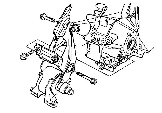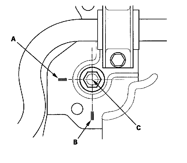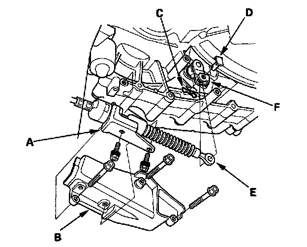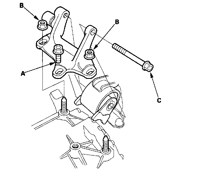 39. Remove the transmission mount bracket bolt (A) and nuts (B), then remove the transmission mount bolt (C).