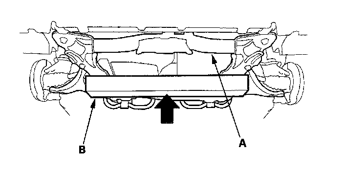 32. Support the sub-frame (A) with a 4 x 4 x 40 inch piece of wood (B) and jack.