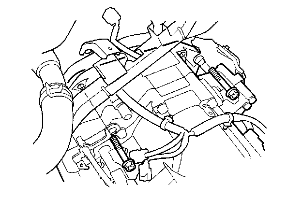 18. Remove the water pipe mounting bolt (A) and lower the water pipe slightly. Loosen air cleaner housing bracket mounting bolt (B), and remove mounting bolt (C).