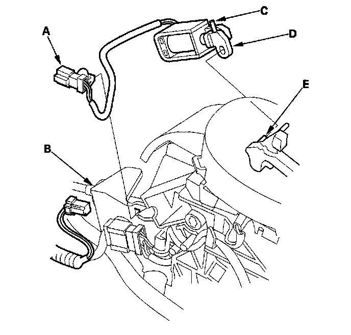 4. Install the new shift lock solenoid (C) by aligning the joint of the shift lock solenoid plunger (D) with the tip of the shift lock stop (E).