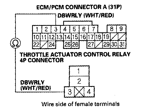 30. Check for continuity between ECM/PCM connector terminal A3 and throttle actuator control module relay terminal No.3.