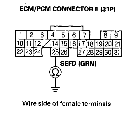 38. Check for continuity between ECM/PCM connector terminal E25 and body ground.