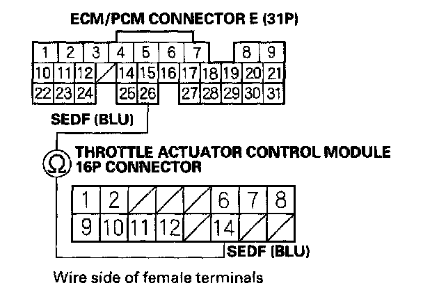 39. Check for continuity between ECM/PCM connector terminal E25 and throttle actuator control module 16P connector terminals No.6.