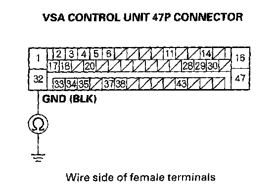 13. Check for continuity between VSA control unit 47P connector terminal No.32 and body ground.