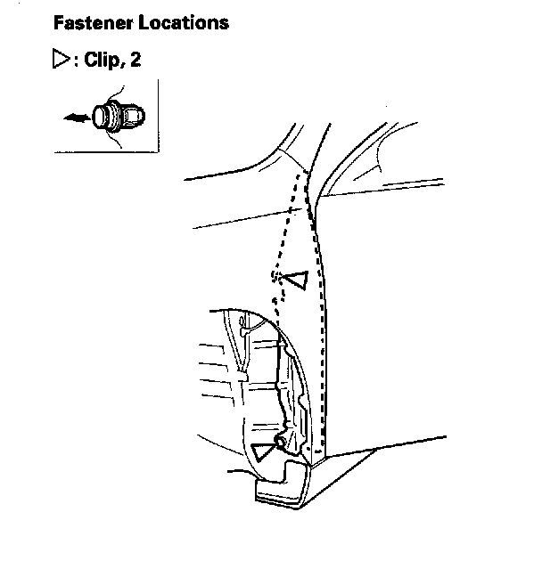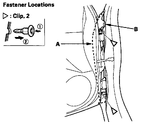 2. Open the front door. Remove the upper clip, and from inside the door, remove the lower clip securing the front fender fairing (A) and front fender(B).