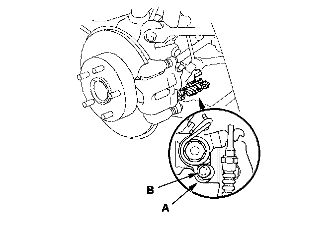 4. Make sure the parking brake arm (A) on the rear brake caliper contacts the brake caliper pin (B).