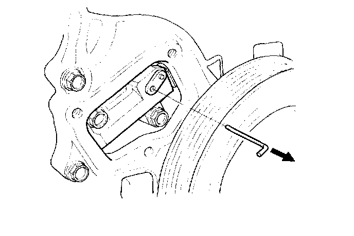 3. Align the holes on the lock (A) and the auto-tensioner (B), then insert a 1.5 mm (0.06 inch) diameter pin (C) into the holes. Turn the crankshaft clockwise to secure the pin.