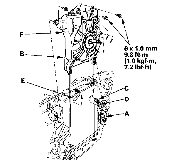 6. Remove the compressor clutch connector (A) from the condenser fan shroud (B). Disconnect the condenser fan connector (C), then remove the wire harness clip (D) from the condenser fan shroud. Remove the hose (E) from the reserve tank (F). Remove the bolts and the radiator fan shroud. Be careful not to damage the radiator fins when removing the condenser fan shroud.