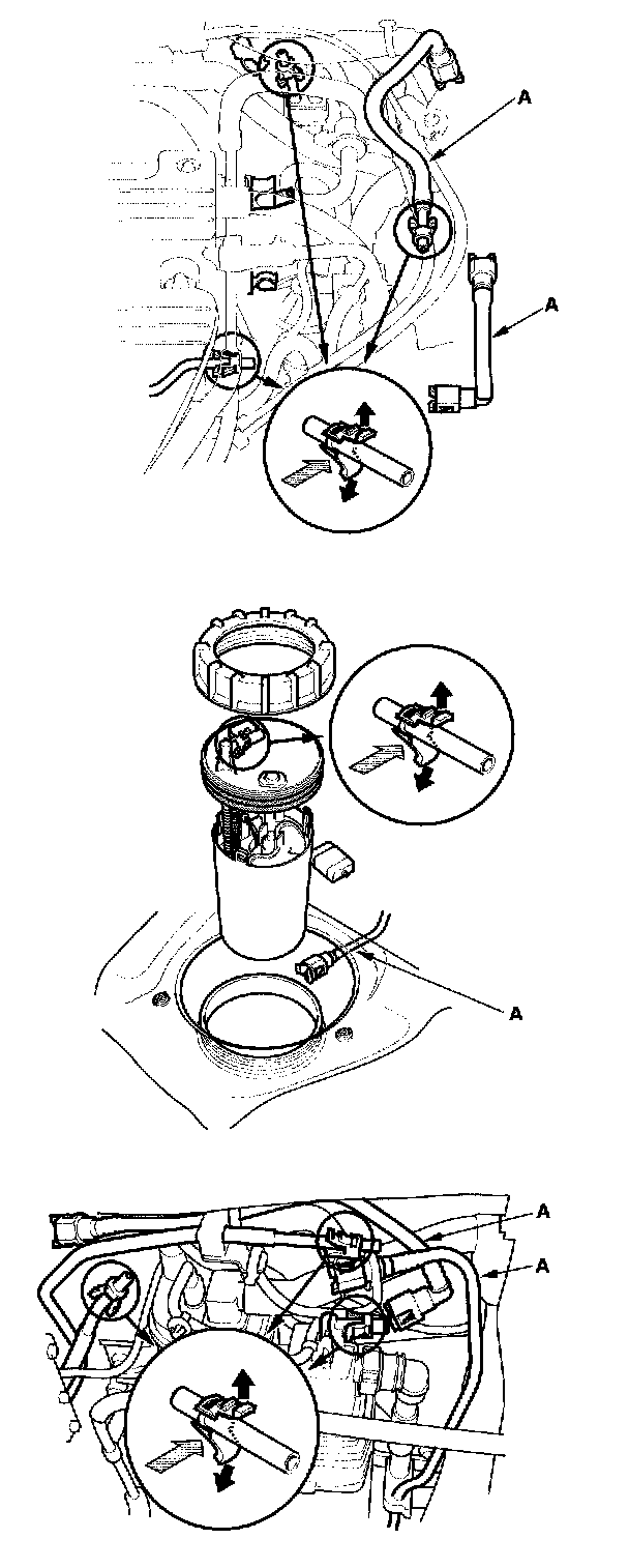 Fuel Line/Quick-Connect Fitting PrecautionThe fuel line/quick connect fittings connect the fuel rail (A) to fuel feed hose (B), fuel feed hose (B) to the fuel feed hose (C), the fuel feed hose (C) to the fuel line (D), the fuel line (E) to the fuel tank unit (F) and the fuel vapor line (G) to the EVAP canister (H). When removing or installing the fuel feed hose, fuel tank unit, or fuel tank, it is necessary to disconnect or connect the quick connect fittings.