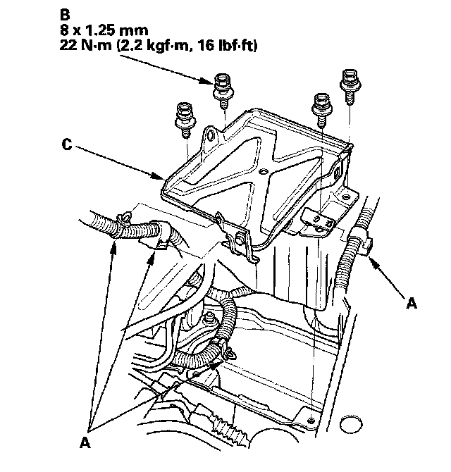 5. Remove four mounting bolts (B), then remove the battery base (C).