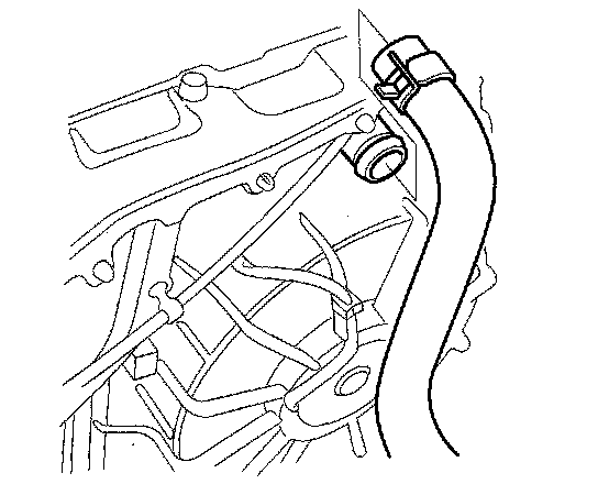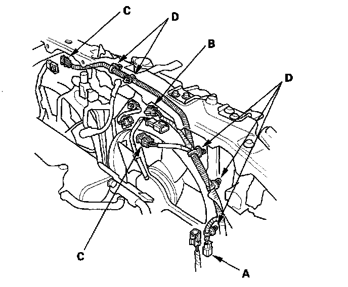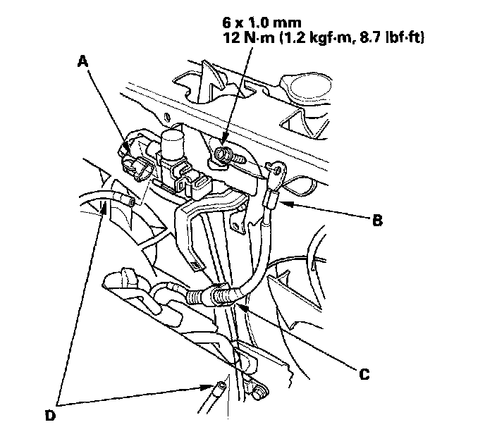 10. Remove the ground cable (B), harness clamp (C), and vacuum hoses (D).