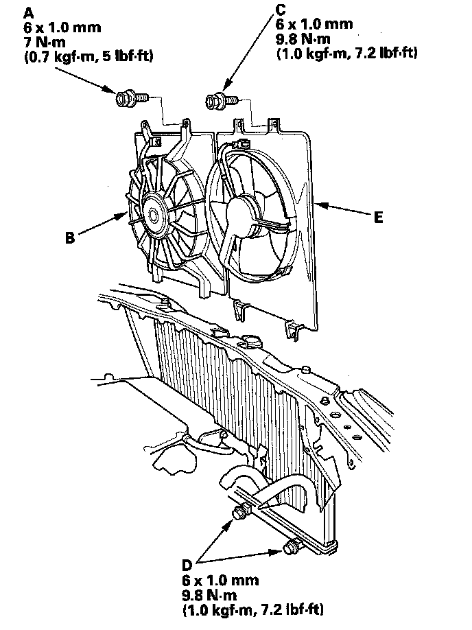 15. Remove the two bolts (C), and loosen the two bolts (D) securing the A/C condenser fan shroud, then remove the A/C condenser fan shroud assembly (E) from the battery side.