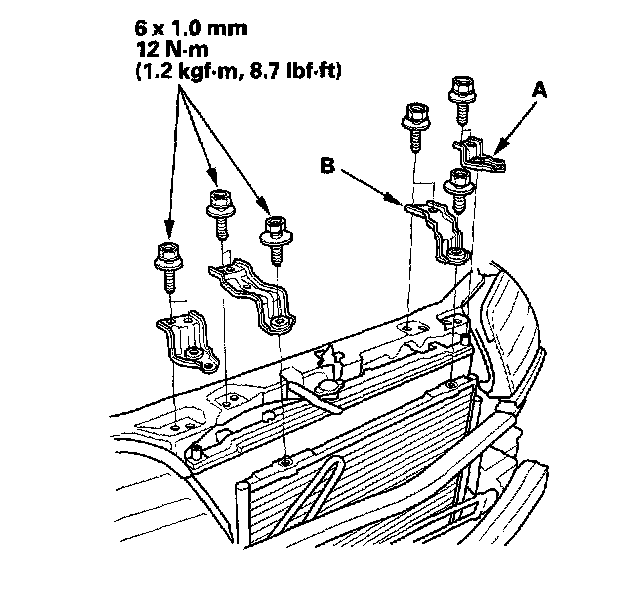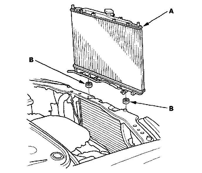 17. Remove the radiator upper brackets/cushions (A) and condenser brackets (B).