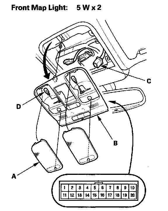 9. If the continuity is not as specified, check the bulb(s) (D). If the bulb is OK, replace the roof console.