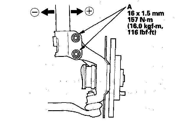 2. Loosen the flange nuts (A) and bolts, and adjust the camber by moving the bottom of the damper within the range of the damper pinch bolt free play. Tighten the flange nuts to the specified torque.