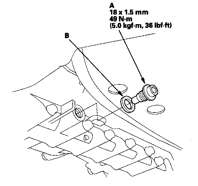 6. Install the filler bolt (B) with a new sealing washer (C).