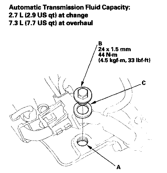 5. Refill the transmission with the recommended fluid into the filler hole (A) to the upper mark on the dipstick. Always use Honda ATF DW-1 (ATF Z1 has been replaced by ATF DW-1, Honda Service News Nov 2010) automatic transmission fluid (ATF). Using a non-Honda ATF can affect shift quality.