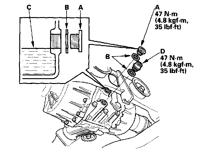 2. Remove the oil filler plug (A) and sealing washer (B), then check the condition of the fluid, and make sure the fluid is at the proper level (C).