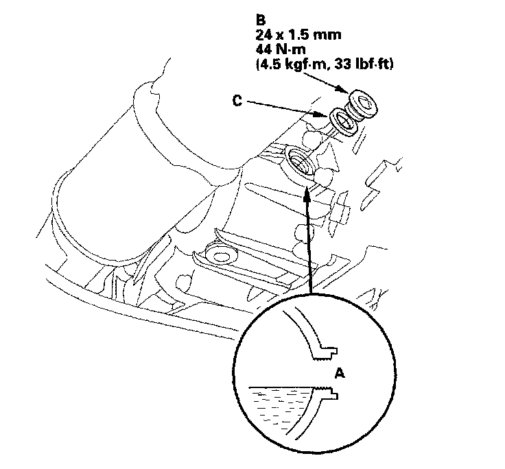 6. Refill the transfer assembly with the recommended fluid (hypoid gear oil) into the filler hole (A) until the fluid from flowing out. Use a SAE 90 or SAE 80W-90W viscosity hypoid gear oil, API classified GL4 or GL5 only.