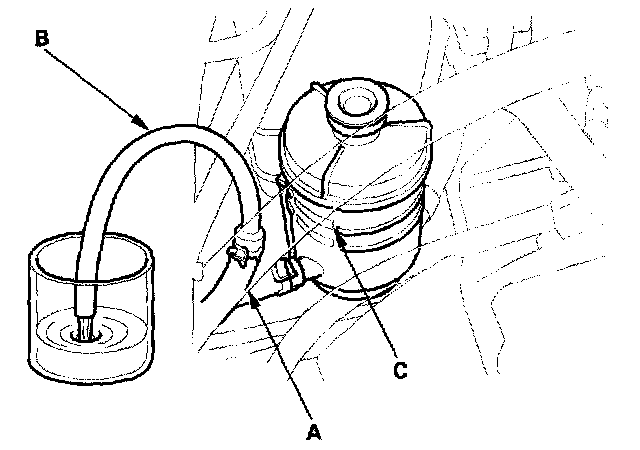 1. Remove the power steering reservoir from its holder. Raise the reservoir, then disconnect the return hose (A) to drain the reservoir. Take care not to spill the fluid on the body and parts. Wipe off any spilled fluid at once.