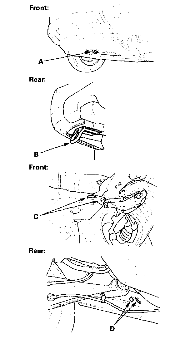 To accommodate flat-bed equipment, the vehicle is equipped with a front towing hook (A), rear towing hook (B), front tie down hook slots (C), and rear tie down hook slots (D).