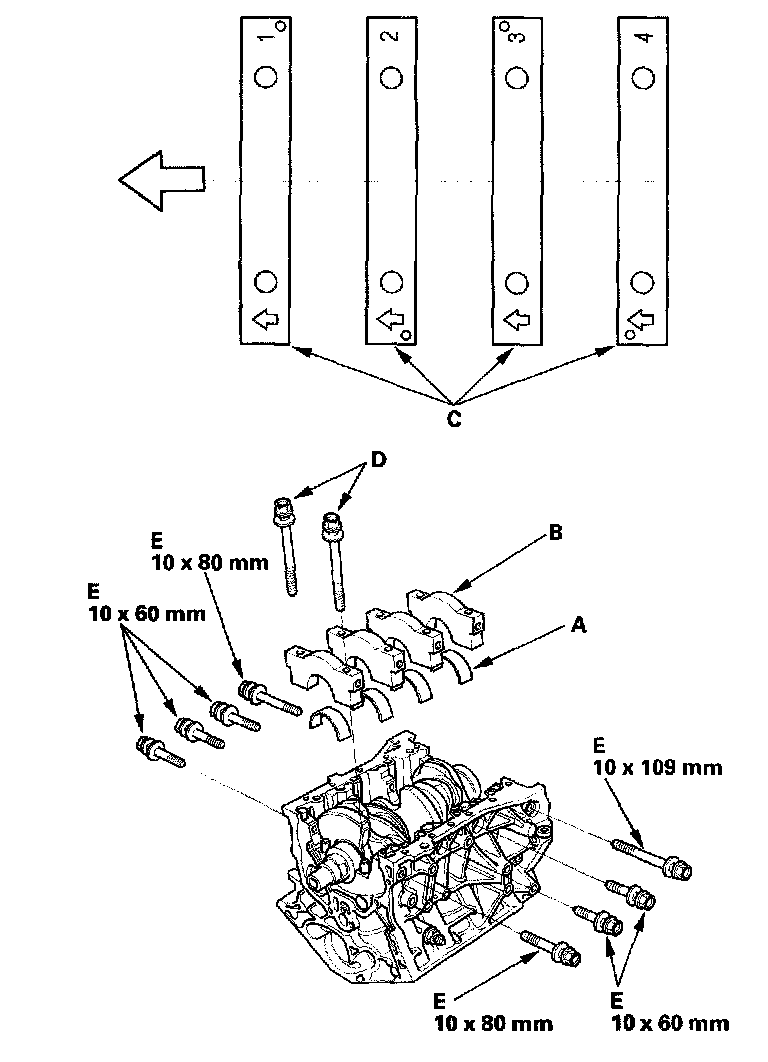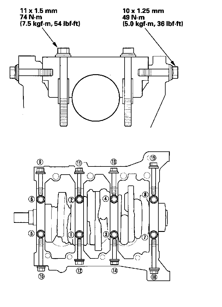Main Bearing CapReinstall the bearings and caps, then torque the bearing cap bolts to 74 Nm (7.5 kgf-m, 54 ft. lbs.), and the bearing cap side bolts to 49 Nm (5.0 kgf-cm, 36 ft. lbs.).