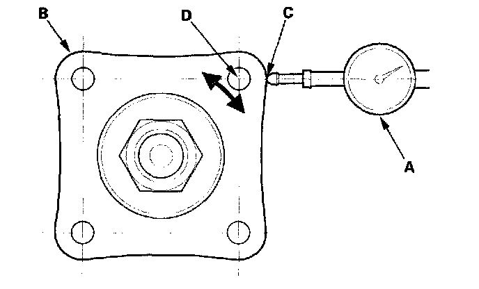 5. Set a dial indicator (A) on the transfer companion flange (B); position dial indicator tip (C) on the direct extension of the bolt hole center (D).