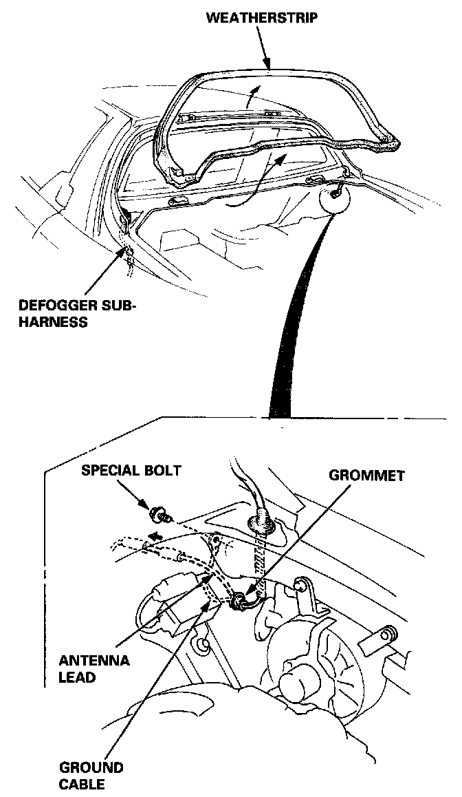 12. Connect the rear defogger sub-harness and ground cable/antenna lead, then install the grommets.