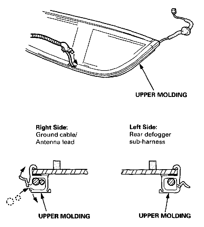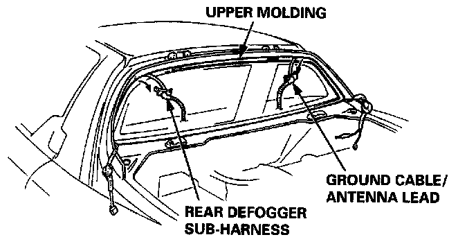 3. Install the rear defogger sub-harness and ground cable/antenna lead in the upper molding.
