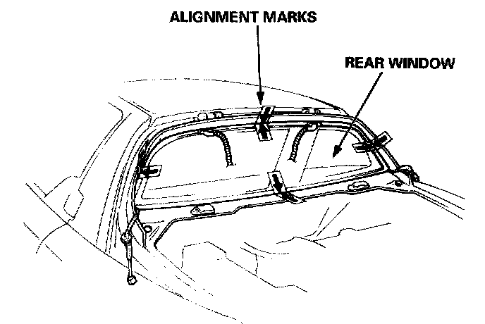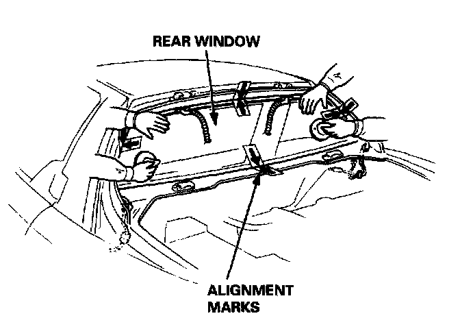 4. Set the rear window upright on the body, then center it in the opening. Make alignment marks across the rear window and body with a grease pencil at the four points shown.
