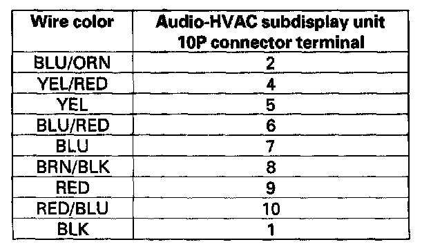 3. Check for continuity between the audio-HVAC subdisplay unit 10P connector and the display panel control unit connector E (22P) terminals according to the table.