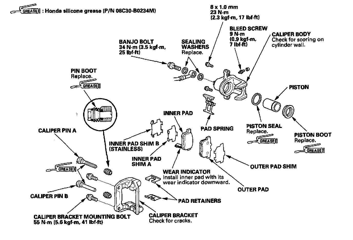 Rear Brake Caliper OverhaulCAUTION: Frequent inhalation of brake pad dust, regardless of material composition, could be hazardous to your health.