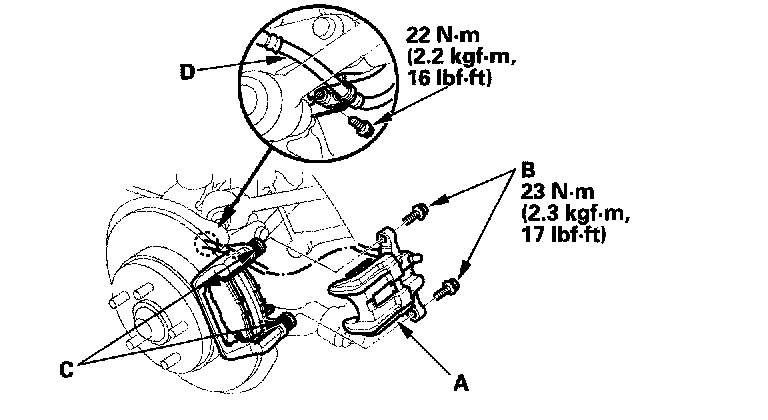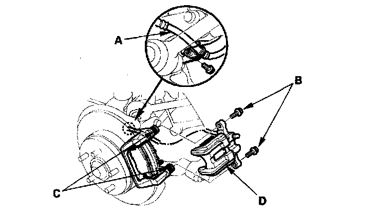 5. Remove the caliper bolts (B) while holding the caliper pins (C) with a wrench being careful not to damage the pin boot, and remove the caliper (D). Check the hose and pin boots for damage and deterioration. Thoroughly clean the outside of the caliper to prevent dust and dirt from entering inside. Support the caliper with a piece of wire so it does not hang from the brake hose.