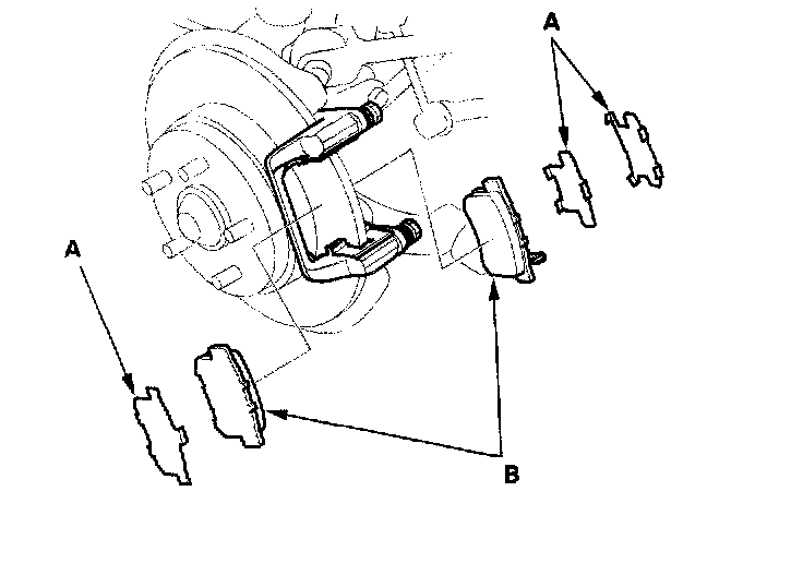 3. Check the thickness of the inner brake pad (A) and outer pad (B). Do not include the thickness of the backing plate.