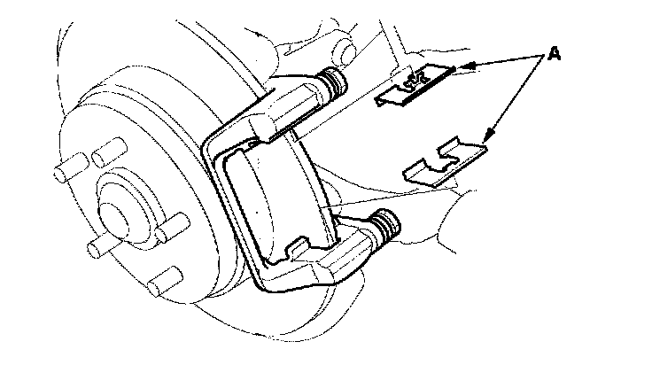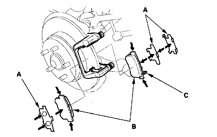 12. Install the brake pads and pad shims on the caliper bracket. Install the inner brake pad with its wear indicator (C) facing downward. If you are reusing the brake pads, always reinstall the brake pads in their original positions to prevent a momentary loss of braking efficiency.