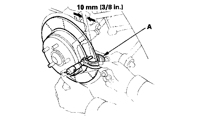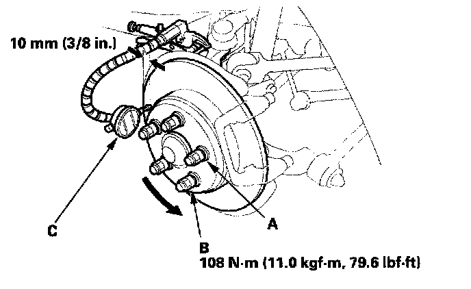 6. Set up the dial gauge (C) against the brake disc/drum as shown, and measure the runout at 10 mm (3/8 inch) from the outer edge of the brake disc.