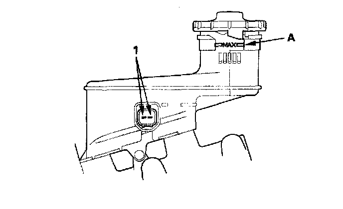 ^ Fill the reservoir with brake fluid to the MAX (upper) level (A). With the float up, there should be no continuity.