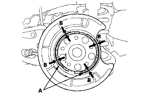 5. Measure the parking brake lining thickness (B). Measurement does not include brake shoe thickness.