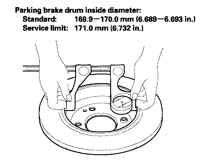9. If the inside diameter of the parking brake disc/drum is more than service limit, replace the brake disc/drum.