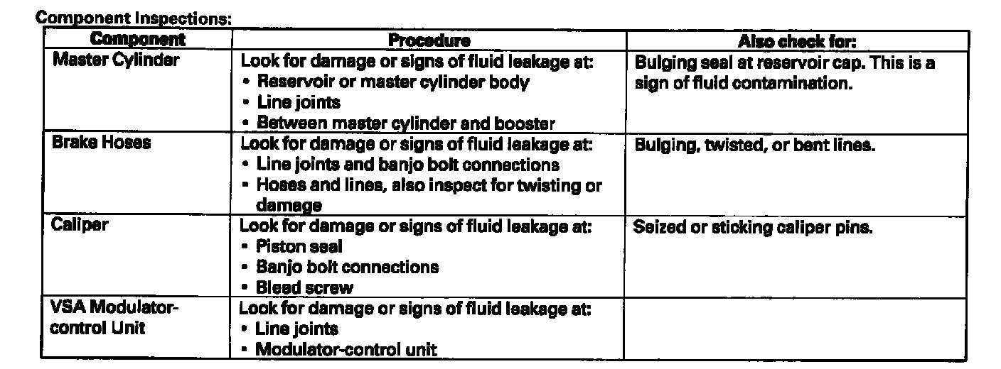 Brake System Inspection and TestInspect the brake system components listed. Repair or replace any parts that are leaking or damaged.