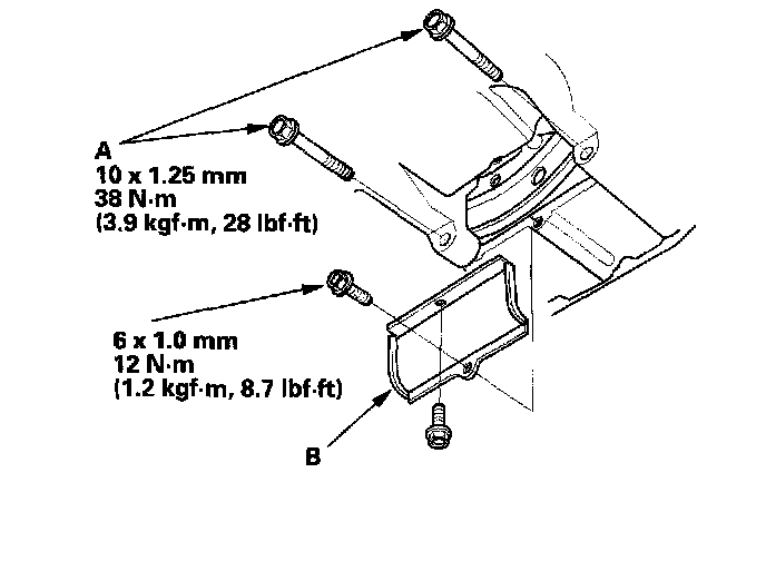 6. Tighten the two bolts (A) securing the transmission, then install the torque converter cover (B).