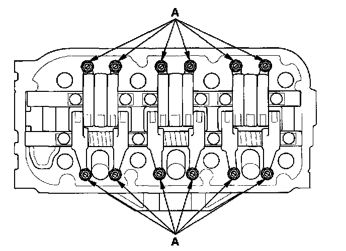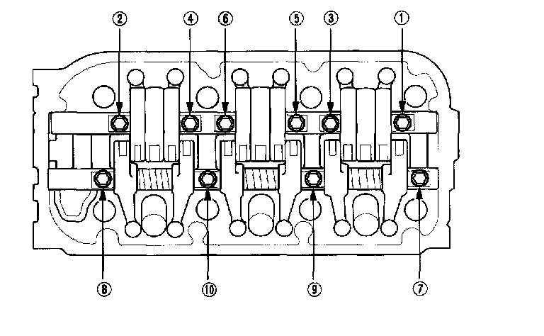 - 2 When removing the rocker arm assembly, do not remove the rocker shaft mounting bolts. The bolts will keep the springs and the rocker arms on the shafts.