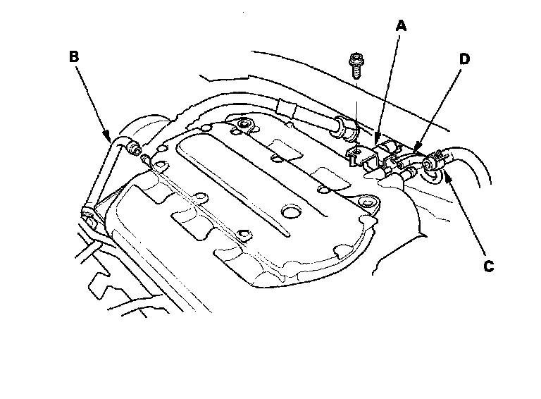 3. Remove the engine mount control solenoid valve (A), positive crankcase ventilation (PCV) hose (B), brake booster vacuum hose (C), and vacuum hose (D).