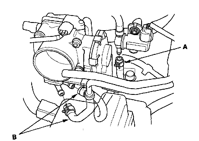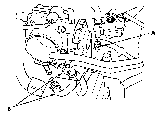 4. Remove the evaporative emission (EVAP) canister purge hose (A) and water bypass hoses (B), then plug the water bypass hoses.