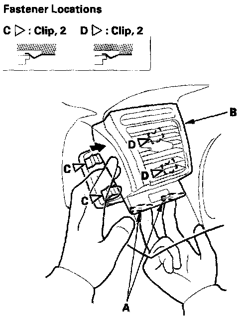 2. Push on the lower hooks (A) by hand to release them. Then gently press up and sideways on the driver's side vent (B) with the palm of your hand to release the outer side clips (C). While gently pressing up on the river's side vent, try it toward the door opening to release the clips (D).