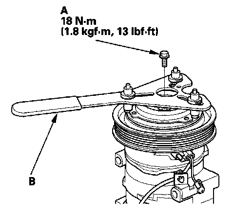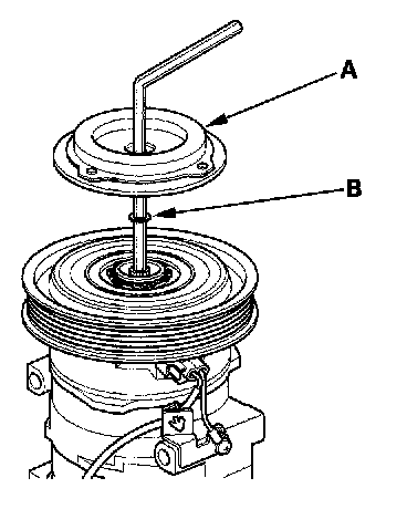 1. Remove the center bolt (A) while holding the pressure plate with a commercially available A/C clutch holder (B).