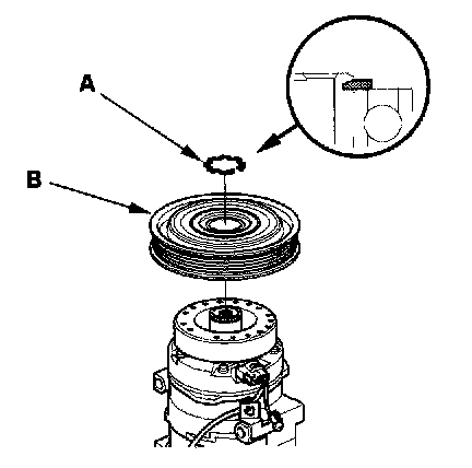 3. If you are replacing the field coil, remove the snap ring (A) with snap ring pliers, then remove the pulley (B). Be careful not to damage the pulley or the A/C compressor.