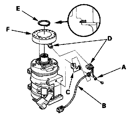 4. Remove the screw from the field coil ground terminal (A), then remove the wire harness (B) and the bracket (C). Disconnect the field coil connector (D). Remove the snap ring (E) with snap ring pliers, then remove the field coil (F). Be careful not to damage the field coil or the A/C compressor.