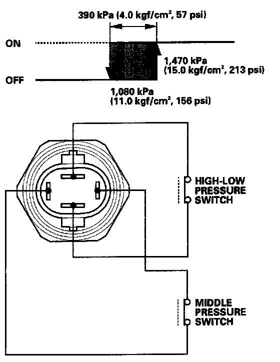 If the refrigerant pressure goes above 1, 470 kPa (15.0 kgf/sq.cm, 213 psi), the A/C pressure switch closes to signal the ECM/PCM to change the speed of the A/C condenser fan and radiator fan to high when the refrigerant pressure drops below 1, 075 kPa (10.1 kgf/sq.cm, 156 psi), the A/C pressure switch opens to signal the ECM/PCM to change the speed of the A/C condenser fan and radiator fan to low.
