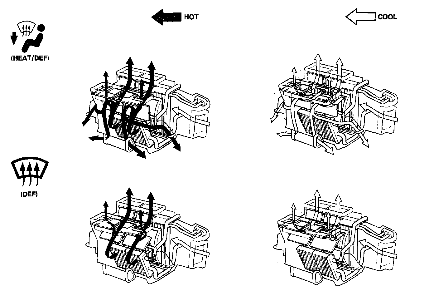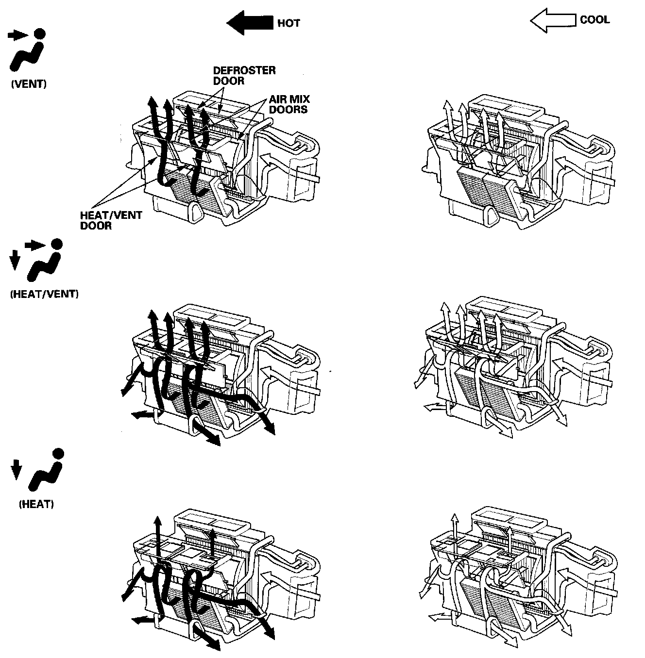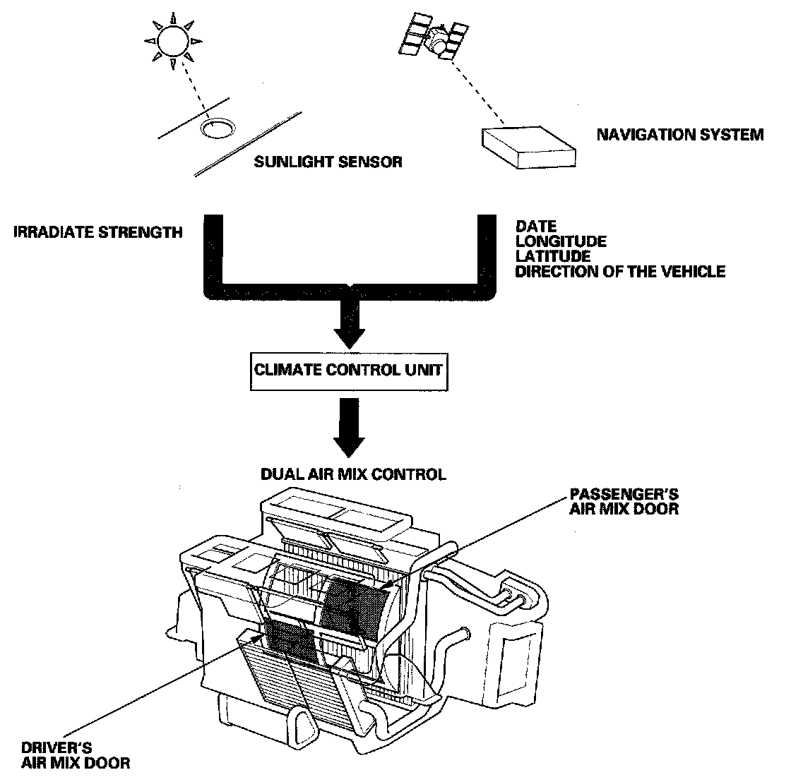 This system automatically controls the temperature and the vent mode of the air direction to the driver and passenger's side depending on the angle of the sun, and the direction of the vehicle. It calculates information such as date, time, longitude, and latitude from the navigation system, as well as the irradiate strength of the sun from the sunlight sensor, to determine the appropriate mode position and temperature to be directed to each side.